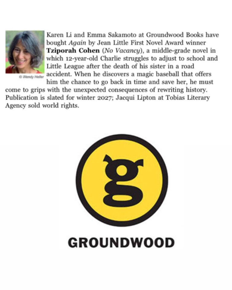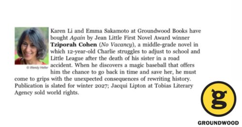 Tziporah’s middle-grade novel, Again, has been acquired by Groundwood Books, and is slated for publication in winter 2027. The details: Karen Li and Emma Sakamoto have acquired AGAIN, in which